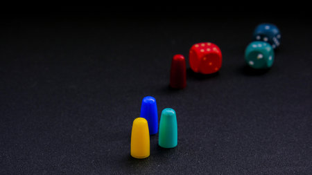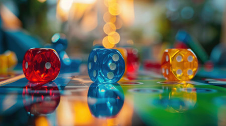 A defocused glimpse of colorful game pieces and dice tered across a table