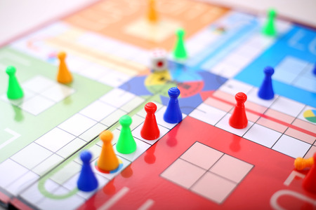 Meeples on a board, ready for playing a parlor game, ludo