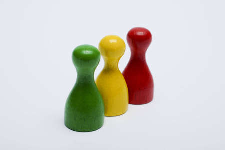 Selection of brightly colored wooden pawns lined up in a row, with a focus on the front pieces