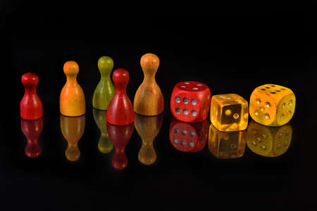 Yellow, red and green figures and playing dice on black background