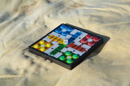 Ludo game with colorful ludo tokens and dice.