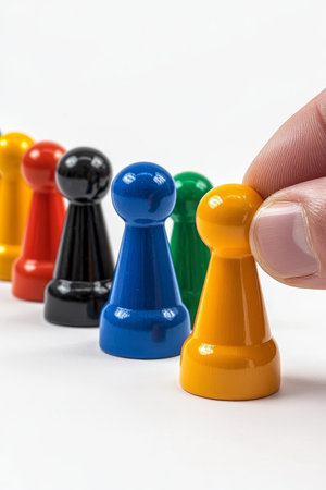 Colorful Game Pieces in a Row, One Being Removed, Symbolizing Exclusion and Competition