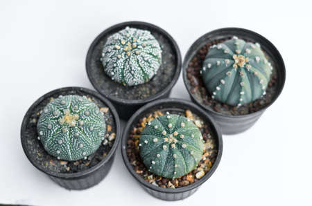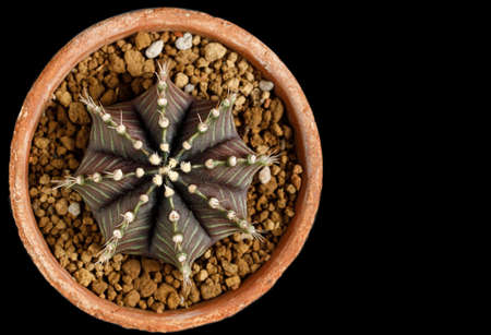 close up shot of cactus in the flower pot or Astrophytum, Astrophythum asterias, on black background with free space