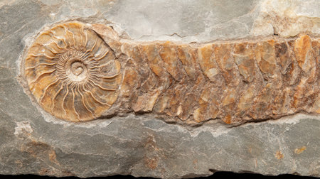 This close-up image features a detailed fossil embedded in a stone surface, showcasing the natural textures and colors of geological history.