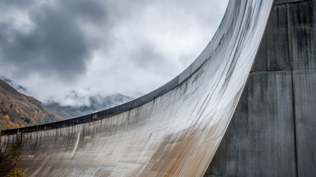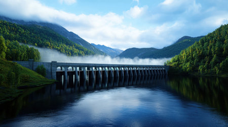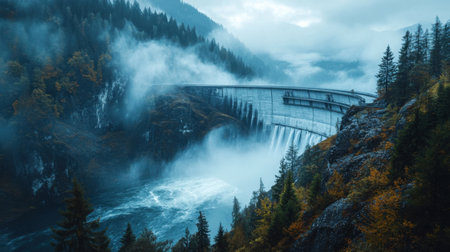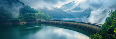 A hydroelectric dam nestled within a breathtaking mountainous landscape, with mist and clouds creating a serene atmosphere.