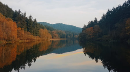 A breathtaking view of a serene lake framed by lush autumn trees. The calm water reflects the vibrant colors, creating a picturesque landscape, perfect for nature lovers.