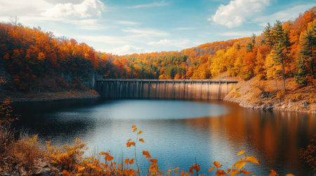 A wide shot of a dam in autumn, surrounded by colorful trees. The sky offers ample copy space for text.