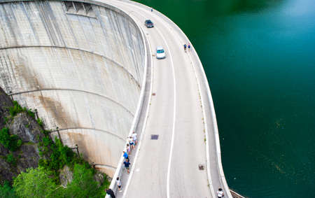 Transfagarasan road, Romania - June 23, 202: Tourists on road passing through Vidraru dam. Top view of Vidraru lake. Transfagarasan road, is one of the most beautiful roads in the world. Carpathians. Romania.