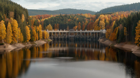 A captivating view of a concrete dam showcases its robust structure surrounded by soft autumn hues. The calm water reflects the serene landscape, creating a peaceful atmosphere.