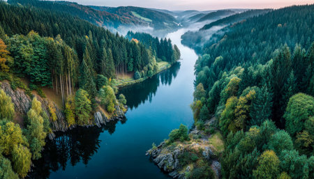 Stunning aerial view showcasing a curved river embraced by dense green forests and shrouded in morning mist with majestic mountains in the background.