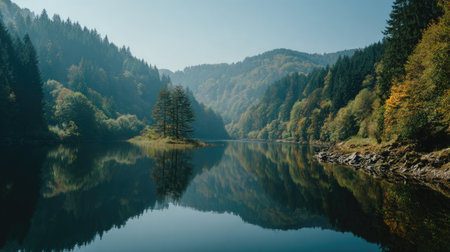 Tranquil mountain lake scene enveloped in mist showcases vibrant autumn foliage. A perfect escape into nature's harmony and a serene atmosphere for relaxation.