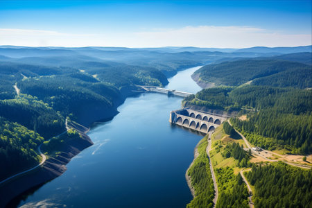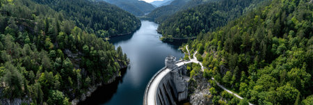 A hydroelectric dam generates sustainable energy preserving wildlife in the surrounding ecosystem. Concept Sustainable Energy, Hydroelectric Dam, Wildlife Preservation, Ecosystem