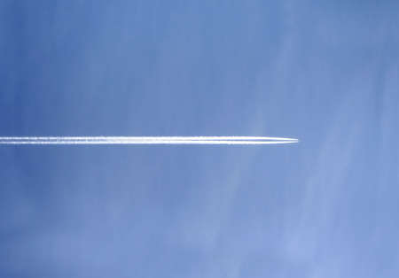 Wallpaper background of an airplane trace in the blue sky. Vignette effect.
