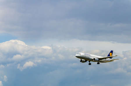 Barcelona, Spain; May 18, 2019: Airbus A320-200 plane of the Lufthansa company, landing at the Josep Tarradellas airport in Barcelona-El Prat