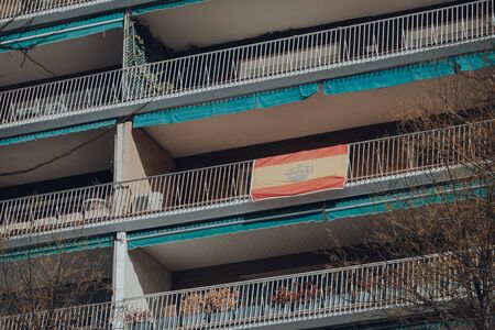 Spanish flag handing on balcony railings of a building in Madrid, Spain.