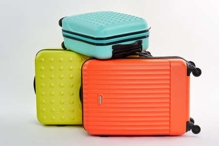 Suitcases on wheel, white background. Colorful objects for voyage trip.