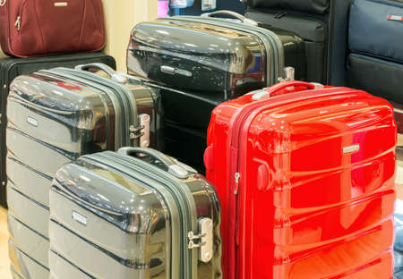 travel suitcases lined up on the counter in the supermarket. Travel and leisure