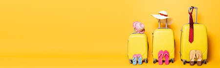 family travel bags with beach summer accessories isolated on yellow, panoramic shot