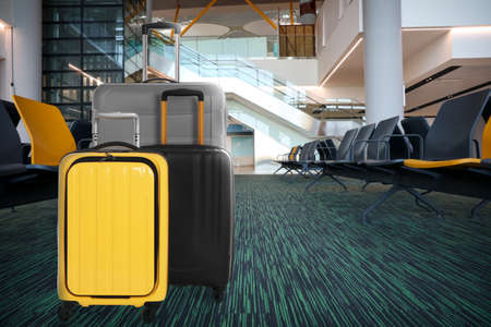 Travel and Fashion. Luxyry luggage, metal roller suitcases at Airport terminal. Waiting at the terminal. Holiday background photo.