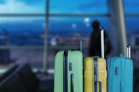 Two suitcases in the airport departure lounge, summer vacation concept, traveler suitcases in airport terminal waiting area,opposite the information board for departure and arrival .