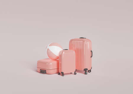 3D illustration of modern pink suitcases and striped beach ball prepared for summer vacation against gray background