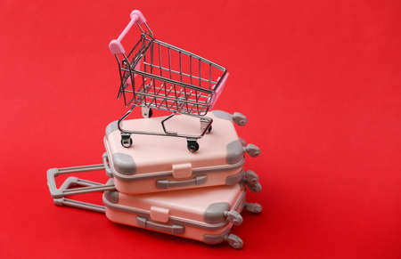 Travel still life, vacation or tourism concept. Two mini travel luggage suitcase and shopping trolley on red background