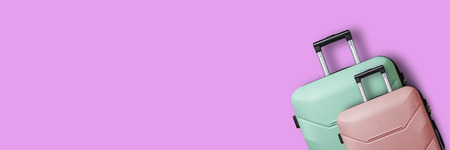 Two Suitcases on wheels on a pink background. Concept of travel, a vacation trip, a visit to relatives. Pink and Green color. Banner.