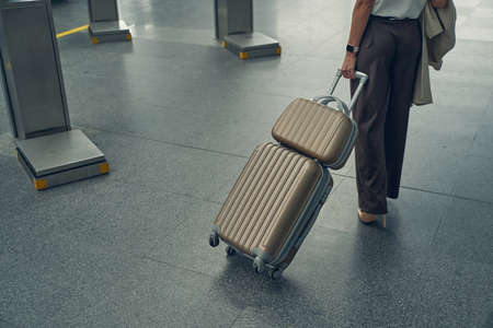 Stylish grey suitcase with wheels on escalator moving stairs near businessman leg in expensive suit and shoes. Business trip concept. Closeup reflective surface of modern hand luggage in airport