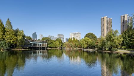 view of a park in China. There are some buildings around the lake
