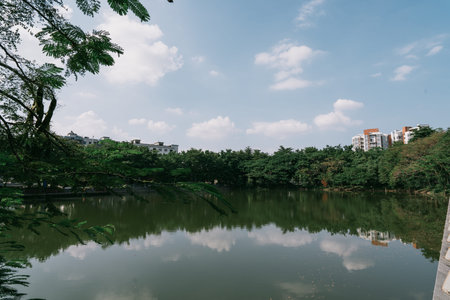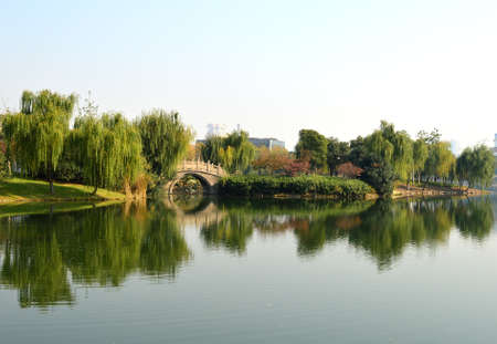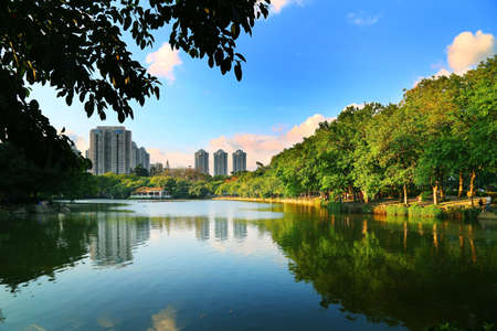 Trees by the lake in the city park. Shenzhen. China.