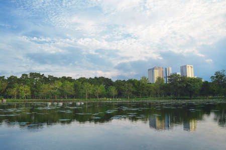 Scenic view of the park in the center of the big city in the summer. With a lagoon in the middle and green trees. In the atmosphere of evening light, Generative AI