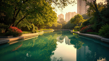 A breathtaking urban oasis captured on a bright, sunny day. This image showcases a tranquil pond reflecting the surrounding architecture and lush green trees. The peaceful water mirrors the city skyline, creating a serene and scenic environment. Ideal for projects emphasizing urban landscapes, nature integration, or a sense of calm and beauty, this photo is perfect for travel blogs, environmental publications, or architectural visualizations. The daylight highlights the beautiful foliage and offers a sense of summer in the city.