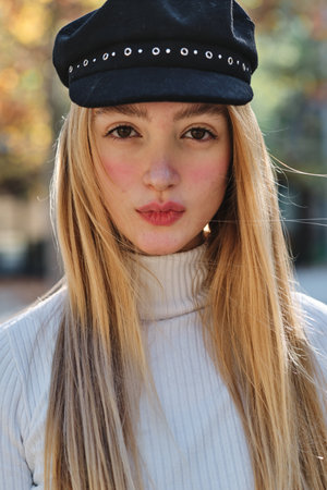 Outdoor portrait of beautiful young woman in coat. Soft focus.