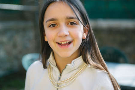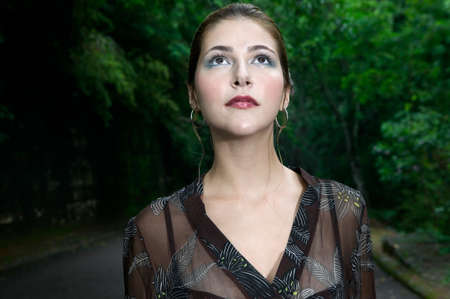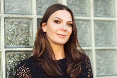 Outdoor close up portrait of young beautiful brunette woman wearing black lace dress
