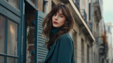 Young beautiful woman with long brown hair in blue coat walking in the city street