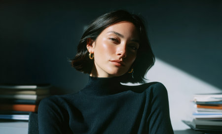 Young woman sits indoors with short hair and earrings. Soft light from a window creates shadows on her face. Books are stacked in the background.