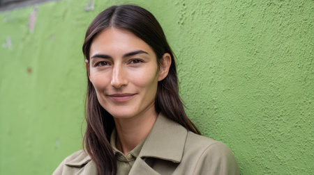 A woman stands against a green wall with a serious expression on her face. Her long hair is styled neatly. The background adds a simple touch to her appearance.