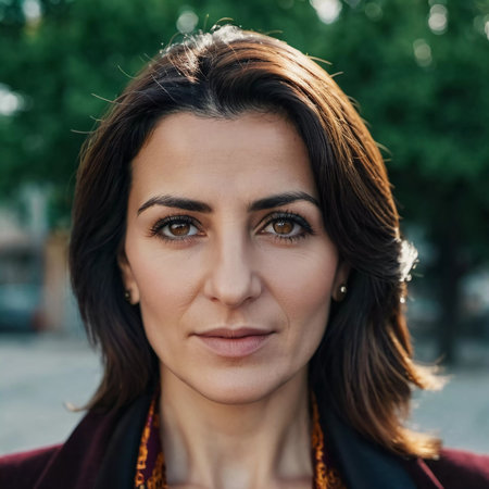 A confident Armenian woman stands poised in a vibrant courtyard, her features illuminating the warmth of the day. The backdrop of green trees adds depth and life to her presence.
