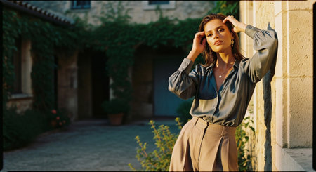 A stylish woman posing outdoors in a sunlit courtyard, wearing a gray blouse and beige high-waisted pants, surrounded by greenery