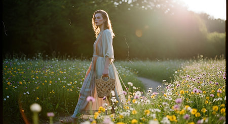 A woman with a serene expression poses elegantly, wearing a floral dress. Her hair is styled in a loose bun, complementing her refined look. Soft lighting enhances her features.