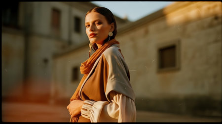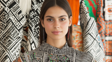 Young Woman in Vibrant Ethnic ed Fashion Against Colorful Textile Background.