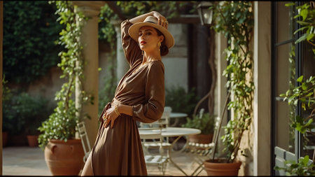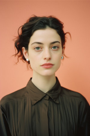 A woman stands calmly in a brown outfit, her long dark hair flowing elegantly. She gazes directly at the camera, showcasing her confident expression in a simple yet stylish setting.