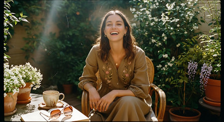 A smiling Caucasian young beautiful woman from France, embodying warmth and joy. Her relaxed demeanor and carefree expression convey a sense of happiness and approachability. Generative AI.