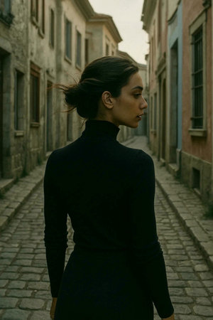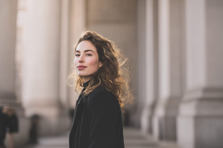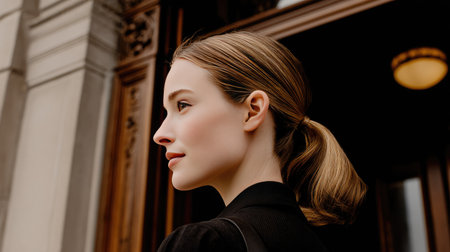 A captivating portrait of a young woman with a stylish ponytail, showcasing her natural beauty against a historic building backdrop in soft light.