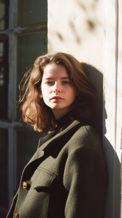 A woman stands next to a green wall in a city, smiling softly. She has long hair and wears a simple coat. The sunlight highlights her features and the wall's texture.