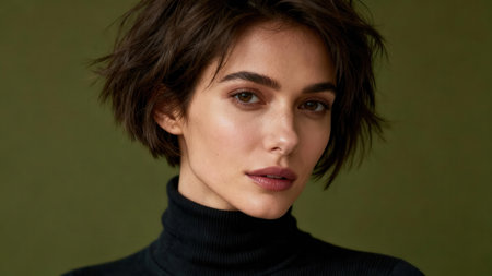 Portrait of a serious brunette woman wearing a ribbed black roll-neck top, emphasizing her defined cheekbones and textured short hairstyle against a smooth dark olive background.