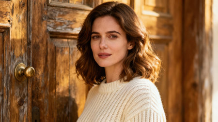 Woman wearing a cream cable knit sweater standing near an aged dark brown wooden door, highlighted by strong golden sunlight emphasizing the texture and featuring a brass doorknob.