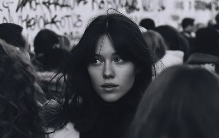 Amid a crowded street filled with people a young woman stands out with her intense gaze. The backdrop features graffiti-covered walls showcasing an urban atmosphere during the day.