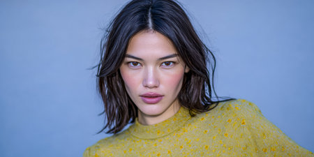 A woman with long, dark hair looks directly at the camera while wearing a yellow sweater. The soft blue background creates a calming atmosphere for the portrait.