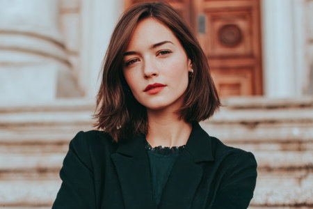 A young woman with shoulder-length brown hair poses on stone steps. She wears a dark outfit and looks directly at the camera, showing confidence. The setting has large wooden doors.